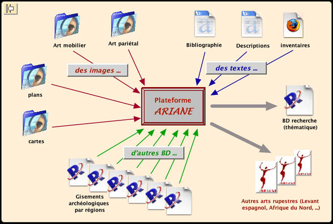 Architecture Ariane![]() Figure 1. Architecture de la base de Données « ARIANE ». La plateforme centrale est alimentée par des textes (notices de sites, descriptions des œuvres d'art, bibliographie, etc.) et des images (cartes, plans, relevés et photographies d'art pariétal et d'art mobilier). La Base ARIANE communique de façon transparente avec d'autres bases concernant l'archéologie des gisements paléolithiques européens. En outre, les images peuvent être utilisées dans des bases personnalisées pour constituer des corpus spécialisés dans le cadre de thèses (cf. thèses de Raphaëlle Bourrillon et de Stéphane Pétrognani). Enfin, il faut noter que cette même structure est facilement adaptable à d'autres arts rupestres (des projets sont en cours concernant l'art d'Afrique du Nord et l'art du Levant espagnol). Figura 1. Arquitectura de la base de datos "ARIANE". La plataforma central es alimentada por textos (reseñas de sitios, descripciones de las obras de arte, bibliografía, etc.) e imágenes (mapas, planos, calcos y fotografías de arte parietal y de arte mueble). La Base ARIANE comunica de modo transparente con otras bases que conciernen a la arqueología de los yacimientos paleolíticos europeos. Además, las imágenes pueden ser utilizadas en bases personalizadas para constituir corpus especializados en el marco de tesis (cf. las tesis de Raphaëlle Bourrillon y de Stéphane Pétrognani). Por fin, hay que anotar que la misma estructura es fácilmente adaptable a otras artes rupestres (proyectos relativos al arte de Africa del Norte y al arte del Levante español están en proceso). Figure 1. Architecture of the database "ARIANE". The central platform is fed by texts (notes of sites, descriptions of the representations, bibliography, etc.) and images (maps, plans, copies and photos of parietal and portable art). The Base ARIANE communicates transparently with the other bases concerning the archaeology of the European palaeolithic sites. On the other hand, the images can be used in personalized bases to constitute specialized corpuses within the framework of theses (vf. theses of Raphaëlle Bourrillon and Stéphane Pétrognani). Finally, it is worth to note that the same structure is easily adaptable to other Rock Art in the world (projects are in progress concerning the art of North Africa and the Spanish Levantine art). |