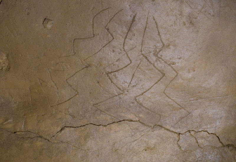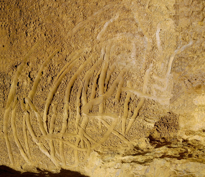 Les manifestations pariétales Des manifestations anthropiques sont visibles sur les parois argileuses. Elles se développent dans plusieurs secteurs de la cavité comme l'ont montré les prospections effectuées en 2006. Un premier inventaire des types de représentations a mis en évidence deux grandes familles de motifs :