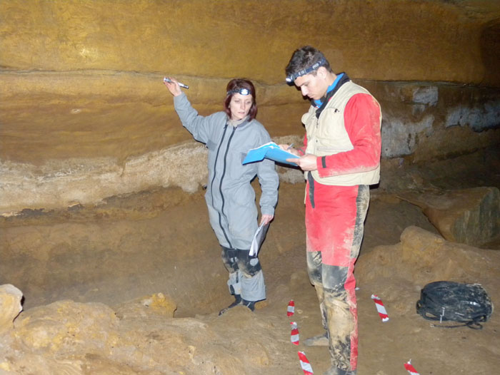 La grotte des Fraux (Dordogne) Découverte en 1989, à la suite de la vidange accidentelle d'un petit lac collinaire, la grotte des Fraux (Saint-Martin-de-Fressengeas, Dordogne) est un site exceptionnel de l'âge du Bronze qui recèle à la fois des vestiges archéologiques et des manifestations pariétales. Les conditions de fossilisation du site, suite à l'effondrement de son principal accès à la fin de l'Age du Bronze, ont permis aux sols de circulation, structures de combustion, structures architecturales, objets archéologiques et œuvres pariétales, de nous parvenir dans un état de conservation exceptionnel. Ils forment un tout indissociable. Par arrêté du 24 octobre 1995, la grotte des Fraux est inscrite au titre des Monuments historiques (n° notice : PA00135171, 1995). Plusieurs articles préliminaires lui ont été consacrés par N. Aujoulat et Chr. Chevillot (cf. bibliographie), mais l'étude a dû être mise en sommeil jusqu'en 2006 pour des raisons de sécurité. Depuis 2006, une équipe pluridisciplinaire dirigée par L. Carozza, chercheur CNRS à l'UMR 5602 GEODE (Toulouse) rassemble archéologues, archéomètres, archéozoologues, pariétalistes et environnementalistes autour d'un projet visant à appréhender la cavité comme un système complexe, non plus réduit à ses deux dimensions spatiales, verticales et horizontales, mais englobant également la dimension du temps, afin de démêler l'écheveau des données archéologiques et paléo-environnementales à l'aide des techniques de l'archéométrie et de la géochimie. Conçu comme une grotte laboratoire, le site est labellisé SEEG (Site d'Études en Écologie Globale) par l'Institut Écologie et Environnement du CNRS. Sols et structures archéologiques Le réseau de la grotte des Fraux se développe à l'horizontale sur environ 1,2 km. Il est constitué d'un ensemble complexe de galeries étroites qui présentent une grande diversité de configurations. Pour faciliter le repérage dans l'espace et la division des zones à étudier, la topographie a été divisée en 25 secteurs. Les études se sont concentrées jusqu'à ce jour dans les secteurs 11, 13 et 18. Des mobiliers archéologiques semblent avoir été déposés de manière ostensible au milieu de chaos de blocs de grès détachés du plafond. Ces zones rocheuses s'opposent à des secteurs aux volumes plus restreints, aux sols argileux fortement colorés par les produits de combustion, sur lesquels apparaissent des vestiges de l'âge du Bronze. Certaines structures de combustion en cuvette, creusées dans l'argile, livrent en surface un remplissage de petits galets et de charbons de bois, témoins de l'exceptionnel état de conservation du gisement. Les premières observations ont permis d'identifier quatre types de vestiges :