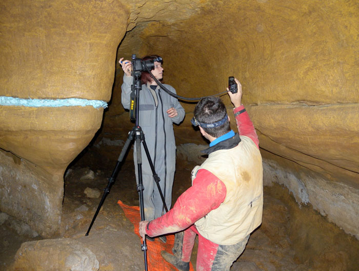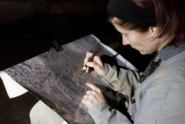 Depuis 2007, l'équipe scientifique s'est focalisée sur les secteurs 11-13 et en particulier sur l'étude du secteur 13 où sera tentée une synthèse exhaustive croisant les données acquises par les différentes interventions (archéologie, relevés pariétaux, 3D, topographie, étude archéométrique des foyers). En ce qui concerne l'art pariétal, le secteur 13 comporte neuf panneaux ornés qui se développent sur les deux parois avec une concentration autour du pilier central (figure 3). À partir du premier panneau de la paroi droite (PI-D), après quelques mètres sans manifestations pariétales, les zones ornées vont s'enchaîner et se charger en motifs organisés, à l'exception du panneau PIII-D. ![]() Fig.3 : Vue d'ensemble du Grand Panneau, secteur 13. Cliché A. Burens. Avec l'aimable autorisation du propriétaire M. E. Goinaud. Au-delà du panneau PV, deux ultimes panneaux ont été identifiés en 2007, en face de la grande jarre (PVI-D), à la bifurcation du secteur 18 (PVII-D). L'étude approfondie du panneau PVII-D, relativement isolé des précédents, a été réalisée en 2008. Ces graphismes ont un statut exceptionnel pour l'âge du Bronze car il n'existe pas, à notre connaissance, de sites présentant des motifs similaires. Malgré tout, les thèmes représentés font preuve d'une grande unité puisqu'ils se répètent le long d'une même paroi (exemple : les signes scalariformes, panneau PII-D, PIV-D et pilier-G) mais également d'une paroi à l'autre (ex : quadrillage, panneaux PV-D et PV-G), ce qui semble être un gage de leur contemporanéité. Techniques de relevé pariétal adaptées au contexte particulier de la grotte des Fraux (cf. http://champslibres.hypotheses.org/121)L'un des principaux objectifs de l'équipe archéologique de la grotte des Fraux est de croiser les approches et d'expérimenter des méthodes novatrices. L'opportunité rarissime de disposer, au sein d'un même gisement, d'artefacts et de structures domestiques fossilisées depuis l'âge du Bronze en relation avec une riche expression pariétale nécessitait la mise en place d'une réflexion méthodologique préalable ; en maintenant une relation étroite entre l'étude des graphismes pariétaux et celle du contexte archéologique sur les sols ou les fouilles, nous essayons, aujourd'hui, de caractériser des comportements et, à terme, d'en comprendre les motivations. C'est dans cet esprit que, dans un premier temps, nous avons choisi d'adapter la méthode de relevé «classique» des manifestations graphiques en opérant en cinq étapes : 1) prises de clichés ; 2) réalisation d'une mosaïque photographique ; 3) exécution du relevé en laboratoire ; 4) contrôle du relevé in situ (figs. 4 à 8) ; 5) traitement infographique. L'intérêt majeur de cette méthode que nous qualifions d'«intermédiaire» est un gain substantiel de temps, le travail de relevé étant effectué en grande partie à l'extérieur de la cavité.