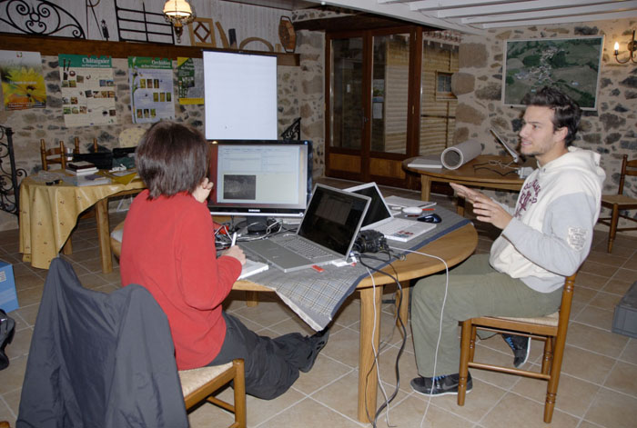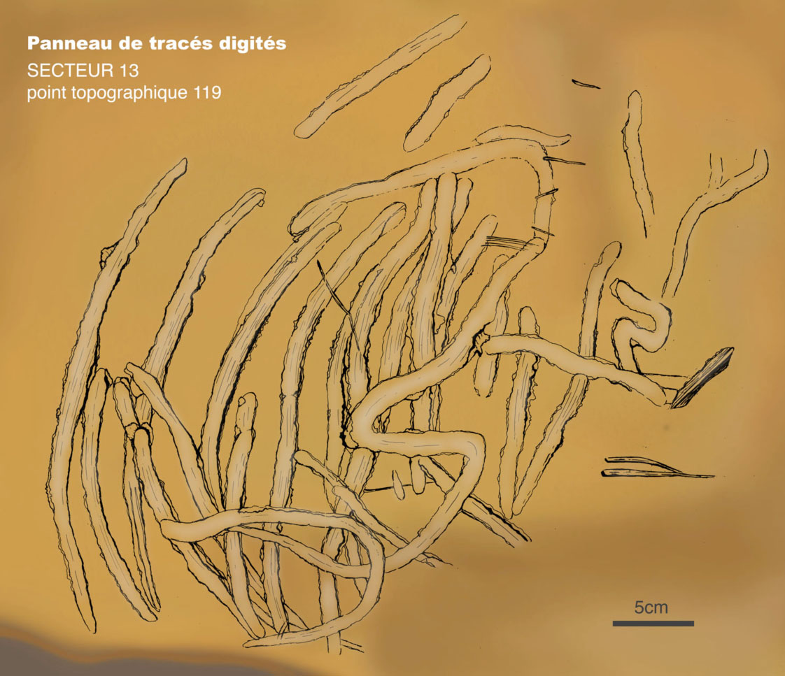 Cliché et relevé Petrognani/Bourrillon. Avec l'aimable autorisation du propriétaire, M. E. Goinaud. Dans une seconde étape de notre réflexion sur l'adaptation des techniques d'enregistrement et de relevé des manifestations pariétales, nous travaillons avec l'équipe PAGE de l'INSA de Strasbourg chargée de l'acquisition 3D de la cavité, ainsi que, pour un secteur particulier de la cavité, avec le Cabinet d'Etude Perazio, spécialiste de l'acquisition 3D, qui a déjà l'expérience de collaborations avec des pariétalistes (Marsoulas, Chauvet). Cette méthode intervient dans l'étude des panneaux ornés à différents niveaux : Géoréférencement des panneaux Support technique au relevé (mosaïque photographique, orthoplan, prises de mesures sur la 3D, section des tracés) Restitution des relevés sur la 3D, ce qui facilite alors la lecture des panneaux et de leur organisation au sein de la cavité Contextualisation des manifestations pariétales par rapport aux données archéologiques. La réalisation conjointe des opérations archéologiques dans un même site constitue un moyen rare (pour un préhistorien pariétaliste) d'aborder simultanément in situ les différents témoins de production matérielle et de choix culturels d'un groupe humain. Nous espérons dans un proche avenir avoir la possibilité de ne travailler que par cette méthode, plus fiable et présentant de nombreux avantages (couplages des données de l'ensemble de la cavité dans un SIG ; absence de déformation des photographies ; coupes dans la paroi pour observer la profondeur des tracés ; prises de mesures...). ____________________ Pour des informations complémentaires sur les recherches conduites dans la grotte des Fraux depuis 2006, nous invitons les visiteurs intéressés à consulter le blog des Fraux. ____________________