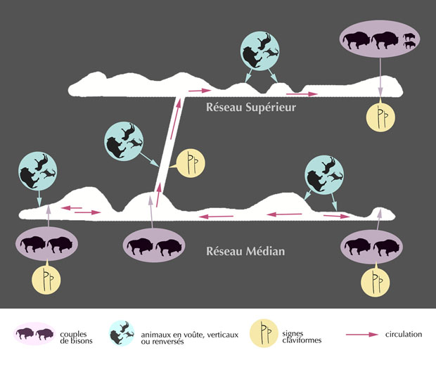 Figure 13 : Les analogies de thèmes dans l'art et leur dispersion dans l'espace souterrain forment les bases de l'unité d'ensemble du Tuc d'Audoubert (doc. Assoc. L. Bégouën).