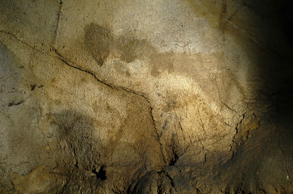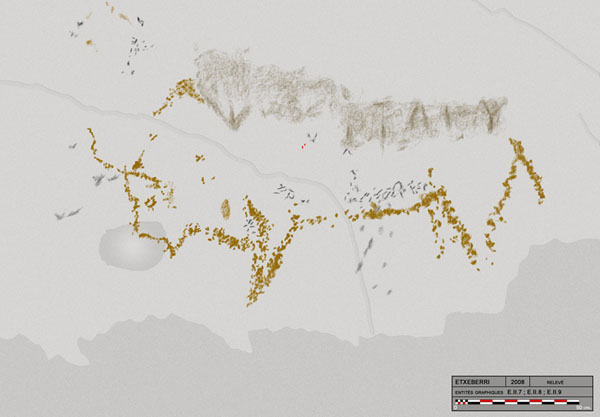 Etxeberri![]() Figure 3. Etxeberri, salle des Peintures: bison à l'argile, état actuel. Il a été maculé récemment par d'horribles graffitis qui ont été ultérieurement grossièrement camouflés. (cliché D. Garate et R. Bourrillon)