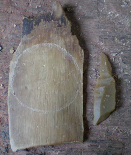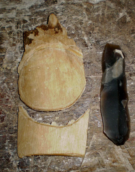 Deux étapes de la chaîne opératoire (cl. L. Aurière). ![]() Rondelles expérimentales (cl. L. Aurière). ![]() Rondelles archéologiques. Disques d'ivoire provenant de la sépulture double de Sungir (Russie) (d'après J. Kozlowski - L'art de la préhistoire en Europe Orientale, CNRS Editions, 1992, fig. 33). |