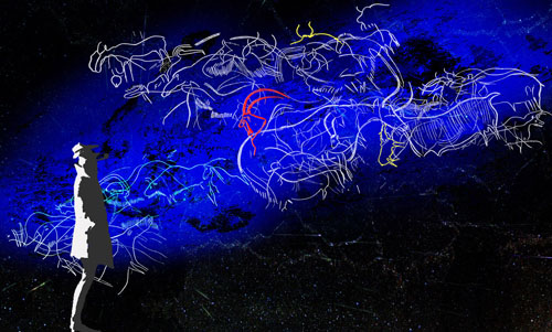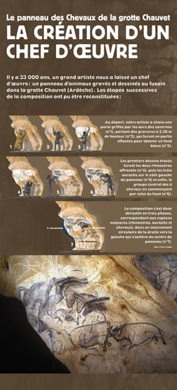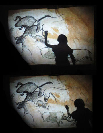 Un film raconte, uniquement par l'image et les gestes, la création d'un chef d'œuvre, le Panneau des Chevaux de la grotte Chauvet, daté de 32 000 ans. Grâce à la projection sur un support en volume qui imite la paroi rocheuse originale, le spectateur voit la composition magistrale naître peu à peu sous ses yeux, l'animation en élégantes ombres chinoises préservant tout le mystère qui entoure l'artiste.