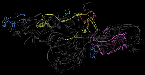 La création du Panneau des Chevaux de la grotte Chauvet-Pont d'Arc (Ardèche) (Yapuca/G. Tosello/C. Fritz). Voir Chronologie du Panneau des Chevaux