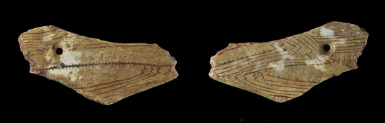 Au mur, derrière la vitrine présentant des pièces originales (dont certaines comme l'os gravé de Troubat sont exposées pour la première fois, un panneau très coloré rassemble des relevés fortement agrandis de galets peints et os gravés aziliens.