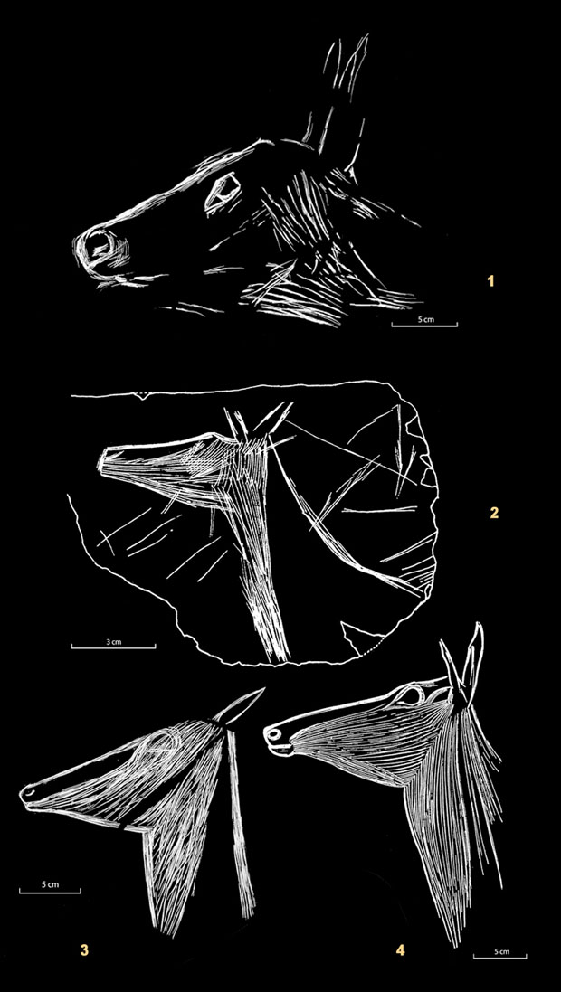 Marsoulas![]() Figure 09 : une tête de biche de Marsoulas (n°1) possède des striures sur la gorge, à l'instar de nombreuses biches de la Région cantabrique gravées sur os (n°2, grotte d'Altamira) ou sur paroi (n°3: grotte de Llonín, Asturies ; n°4: grotte du Castillo, Cantabrie). 1. Doc. C. Fritz et G. Tosello ; 2. d'après I. Barandiarán ; 3. d'après J. Fortea Pérez ; 4. d'après H. Breuil. |