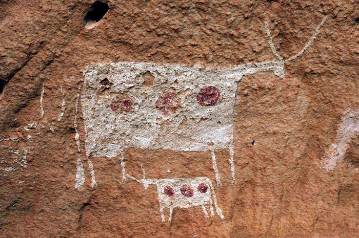 Ennedi highlands![]() Figure 4. Mornou : Often the individuality of single animals is emphasised through a very peculiar pattern of the coat, sometimes even in non-natural patterns. This could possibly suggest that the skin of the cattle may have been painted in reality, such as can be found among some African pastoralist groups of today. ![]() Figure 5. Mornou : Engravings of cattle are much rarer than paintings in the Ennedi but this very careful depiction shows many details and indicates the high esteem of cattle that seems to have belonged to a cattle centered ideology (cf. "cattle complex"). ![]() Figure 6. Mornou : In depictions of cows with their calf the painters often empasised the genealogical sequence by a very same pattern of the coat even if it was a non-natural pattern. |